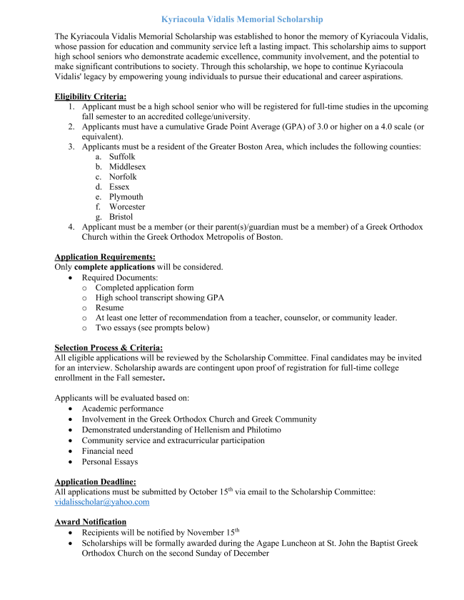 Please remember the ministries of our Church as you make your weekly offering! Please send your donation to the Church office, OR donate online by clicking the button below: | | Kyriacoula Vidalis Memorial Scholarship | | | Sunday School News