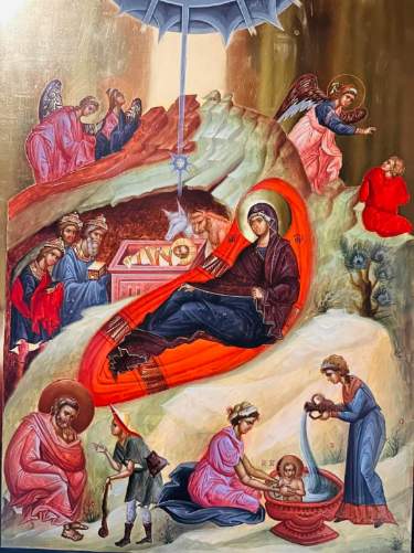 | Apolytikion of the Feast Mode 4. Your nativity, O Christ our God, has caused the light of knowledge to rise upon the world. For therein the worshippers of the stars were by a star instructed to worship You, the Sun of Righteousness, and to know You as Orient from on high. Glory to You, O Lord. |